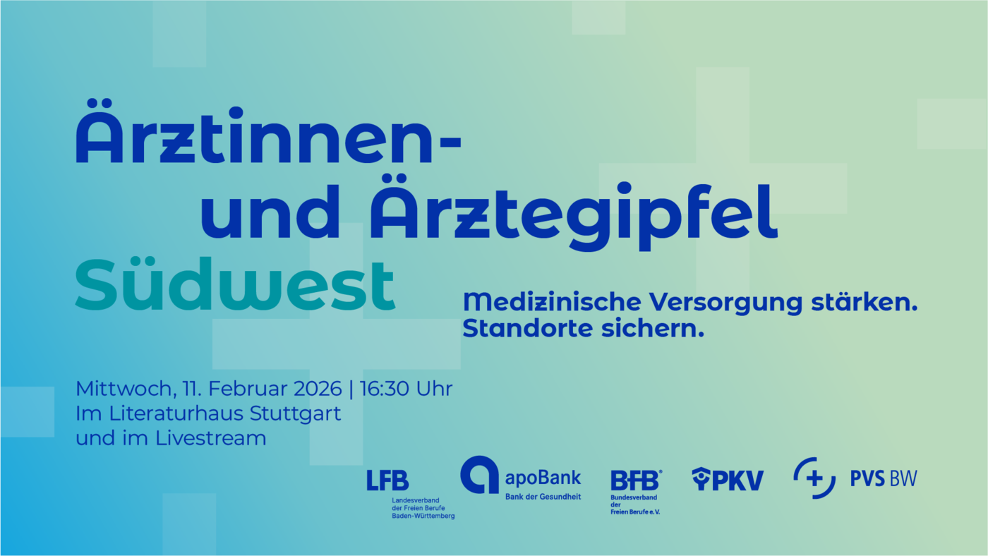 um das deutsche Gesundheitswesen zukunftsfähig zu machen, müssen wir heute die Weichen stellen. Eine verlässliche ärztliche Versorgung in den Regionen, eine angemessene Finanzierung sowie eine moderne, digitale medizinische Infrastruktur entscheiden mit über attraktive Standorte. Wohin steuert die Politik? Wie sieht die Zukunft des Arztberufs aus? Wann kommt die neue Gebührenordnung für Ärzte (GOÄ)? Auf dem Ärztinnen- und Ärztegipfel Südwest bringen wir Politik, Ärzteschaft sowie weitere Akteure des Gesundheitswesens zusammen. Der Verband der Privaten Krankenversicherung (PKV), die Privatärztlichen Verrechnungsstellen (PVS), die Deutsche Apotheker- und Ärztebank (apoBank) und der Bundesverband der Freien Berufe (BFB) laden herzlich zu diesem Panelgespräch ein.